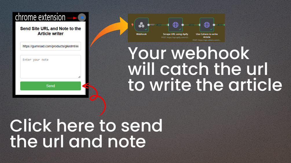 - A Chrome extension is used to send a URL and an additional note as input to the workflow. This data is captured by a webhook in n8n.